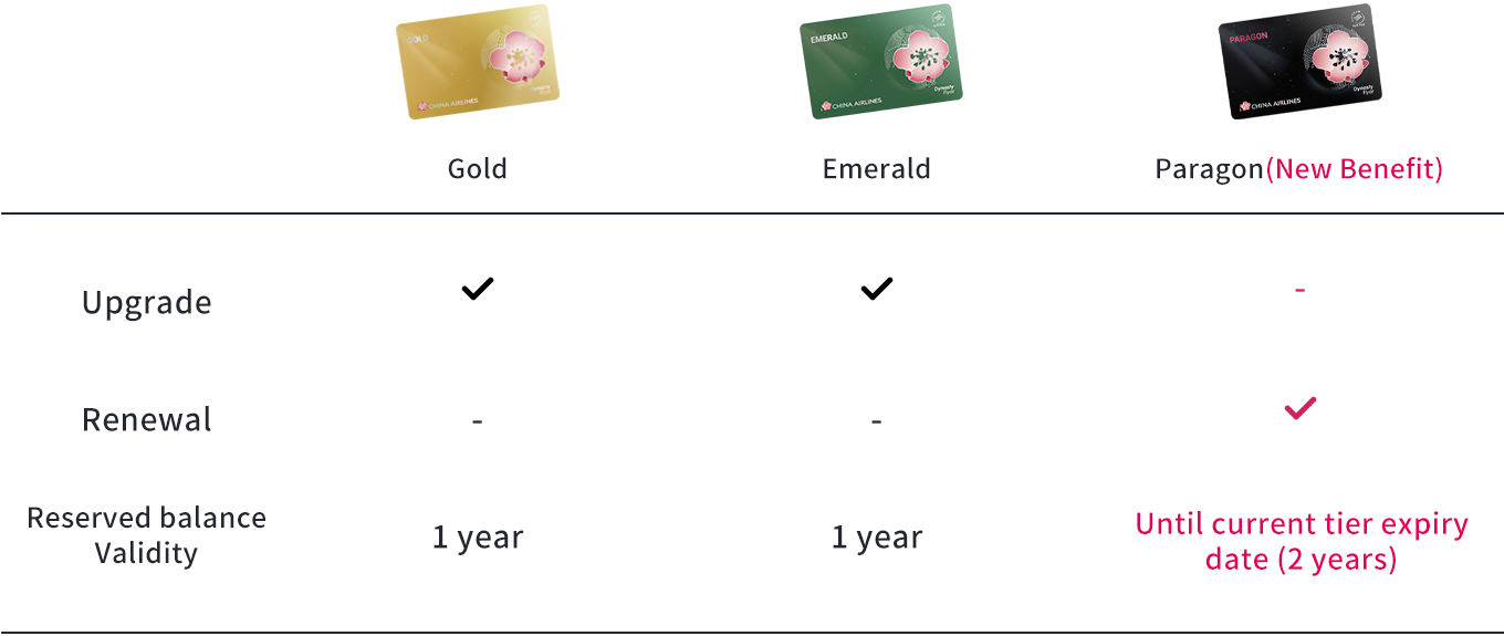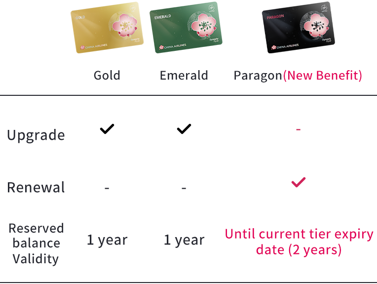 * | Tier Upgrade – Within any 12 consecutive months of your current tier, the total amount of Status Points should reach the requirement, with at least 50% from CI/AE self-operated international flights. Your tier will be upgraded immediately upon qualification. |